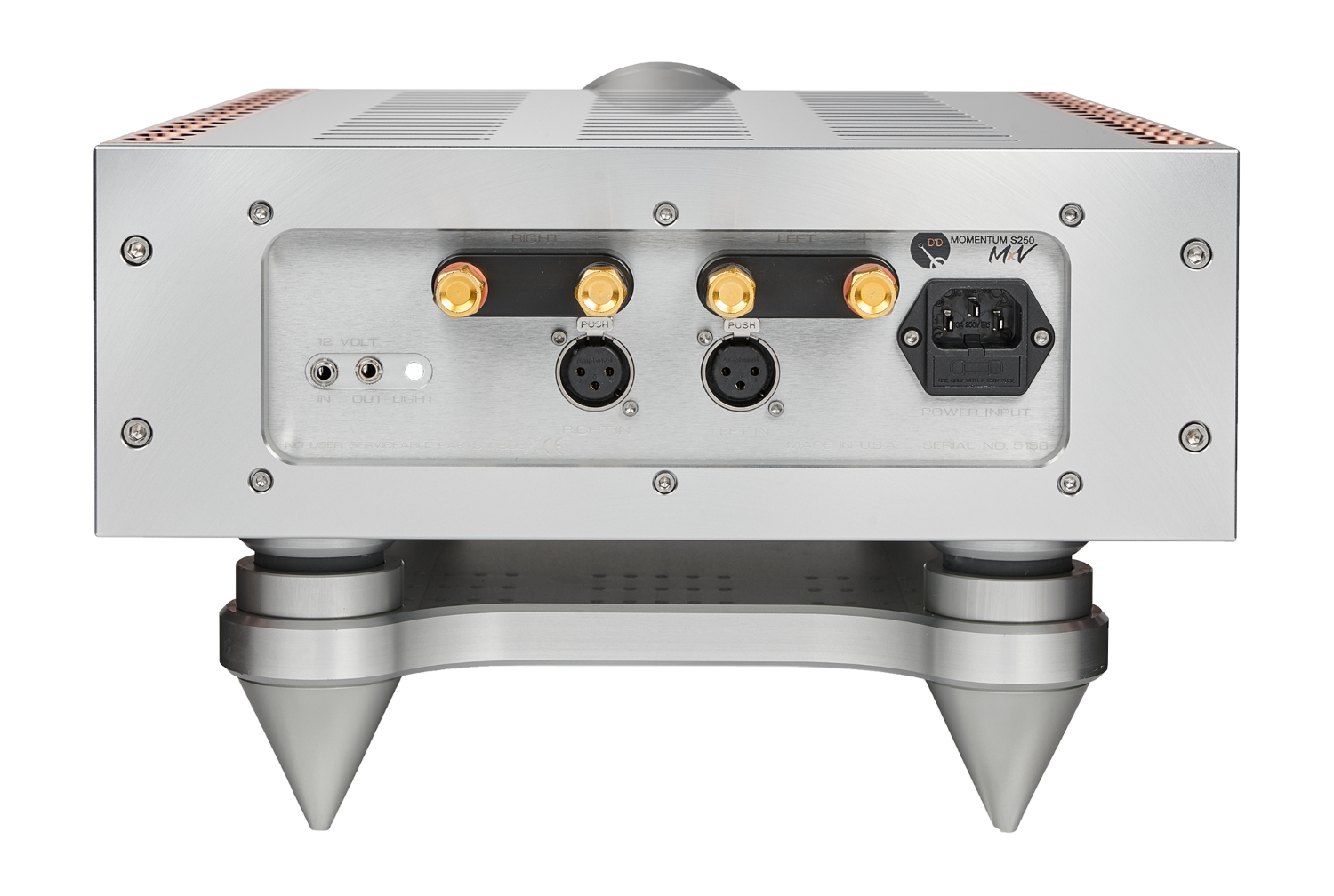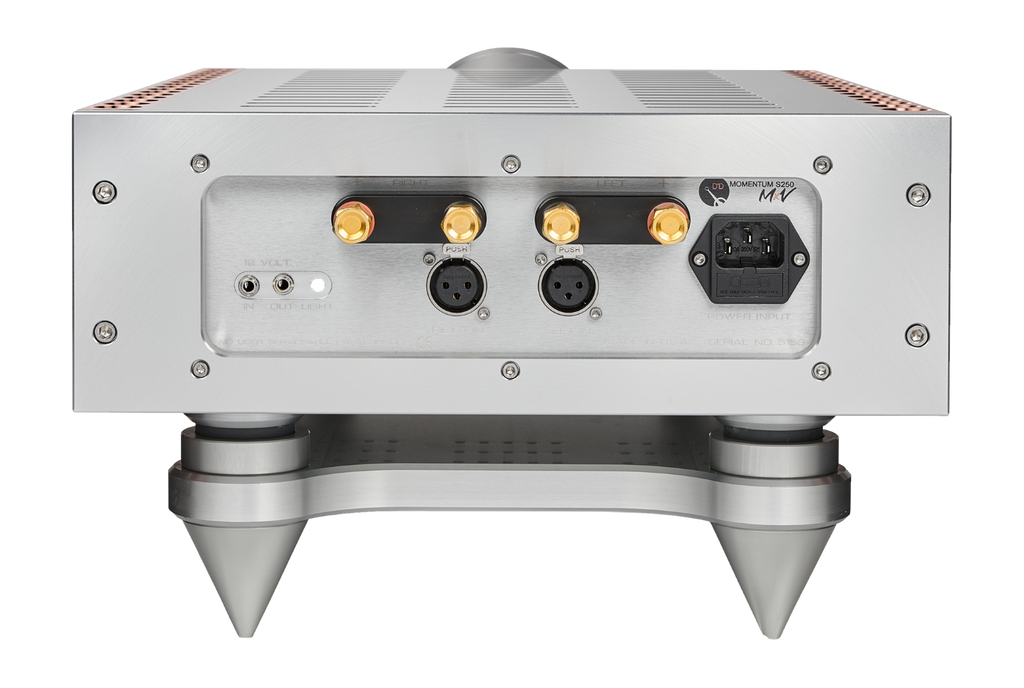 Delivering the extraordinary sound quality of the Momentum M400 MxV Monoblock, the Momentum S250 MxV Stereo Amplifier features techniques and topologies developed and implemented in the Relentless Series. This fullest expression of the Momentum circuitry is reflected in the model’s name, MxV. Those with a physics background will recognize that MxV, or Mass times Velocity, is the equation for Momentum.