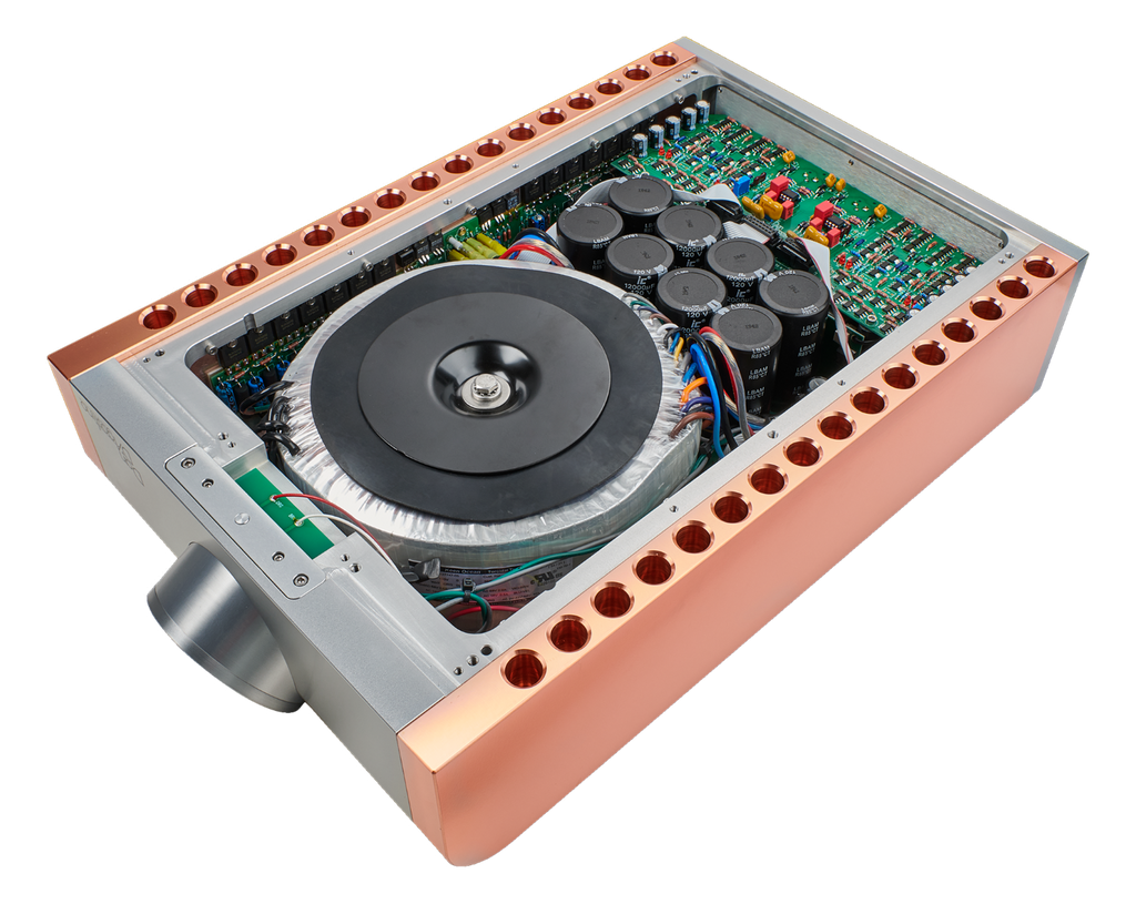 Energizing the driver stage is a bias stability circuit providing a nearly 50% increase in operating bias. Increasing Class A operation directly correlates to better sound quality. However, there is a limit to bias level in any amplifier. With this new circuit topology and our unique copper heatsinks, thermal issues are not a practical concern, preventing excessive temperatures even under the greatest demand. Additional power transistors in the output stage reduce workload foreach device, so the entire output section works more efficiently. The result is a richer, more dynamic, and intimate presentation of the music.
