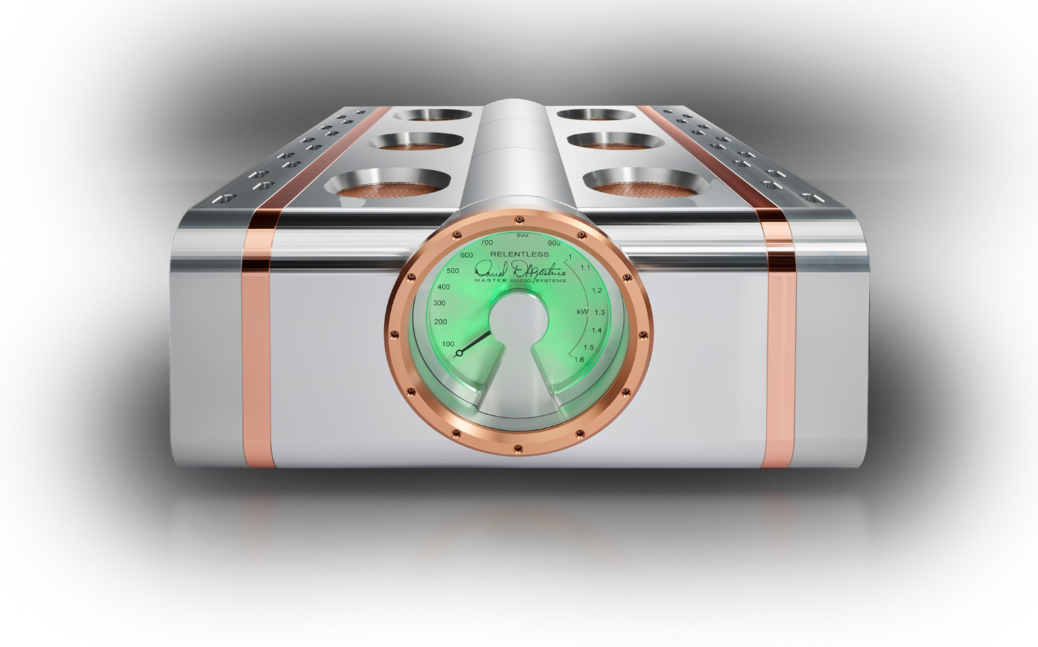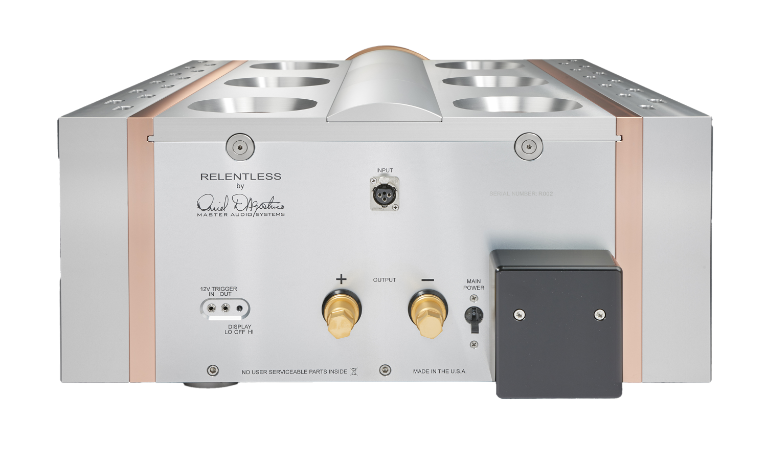 The power meter of the Epic 1600 measures more than eight inches in diameter. Range and response automatically adjust to the level of the incoming signal, making it easy to read no matter how quiet or loud the musical passage. The amplifier’s unique heat sink combines copper and aluminum that wicks away heat from the connected devices, using an elaborate elliptical design, allowing the amplifier to run safely and reliably even when delivering full rated power. Thermal, short circuit, and DC protection are included in a non-invasive but comprehensive defense against any external system faults. The chassis of the Relentless Epic 1600 is machined from solid aluminum, for superior shielding, thermal stability and vibration damping. High-precision milling allows the entire chassis to fit together solidly with no visible fasteners. The Epic 1600 offers a single XLR balanced input, while speaker cables connect using massive custom-made binding posts made from gold-plated brass. Using the same chassis as the original Relentless Monoblock Amplifier allows upgrades to Relentless Epic 1600 level.
