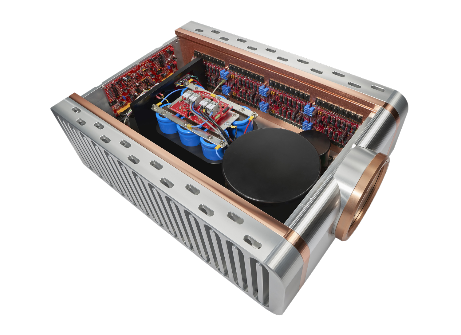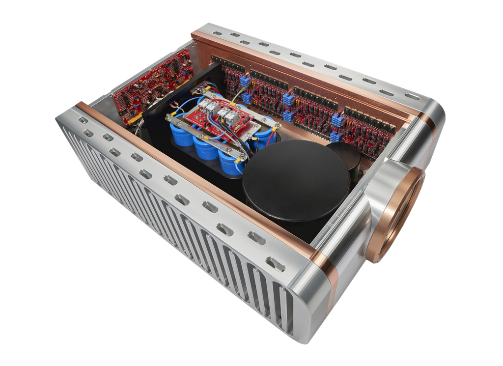 Crucial to the new circuit are the bipolar transistors powering the front end of the amplifier. Activating the driver stage is a new bias stability circuit providing a nearly 50% increase in operating bias. Increasing Class A operation directly correlates to better sound quality. With this circuit topology and the unique copper/aluminum heatsinks, thermal issues become irrelevant. The new bias scheme ensures bias consistency, preventing excessive temperatures even under the greatest demand. Additional regulation circuitry prevents any AC power anomalies from upsetting the amplifier’s input circuitry. The core of the power supply is a 5.5 KVA linear transformer that uses multiple sections running in concert, potted and encased in a metal shield. This design reduces transformer noise to nearly zero and protects the audio circuitry from the transformer’s magnetic field. The transformer feeds a custom-designed rectifier circuit and a600,000-microfarad/100-volt capacitor bank.