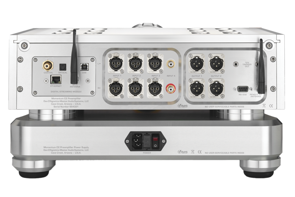 The Momentum C2 Preamplifier offers an optional DSM that adds connectivity for legacy sources, USB functionality, and premier streaming capability. Field upgradeable, the DSM adds SPDIF coaxial, optical, USB-B, RJ45, and Wi-Fi network inputs. For latency-free playback of high-resolution network content,10/100/1000 Gigabit Ethernet is supported.