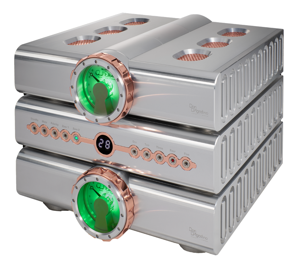 Featuring only balanced XLR inputs, the Relentless Preamplifier topology rejects common-mode input noise over an unusually wide bandwidth. All signal gain is realized in the current domain using proprietary multiple-output current mirrors with nearly 30 times the linearity of other designs. The use of four-layer circuit boards dramatically reduces distortion and propagation levels as compared to more commonplace, two-layer boards. The analog and digital circuit elements are isolated, including ground planes, from each other. Where necessary, digital control signals are optically coupled to analog circuits. The signal switching relays are hermetically sealed and use gold-plated contacts for maximum signal integrity. Utilizing no negative feedback anywhere, core D’Agostino circuit concepts include a signal path that is fully complementary and balanced from input to output, achieving a frequency response flat to 120 kHz. The overall result is a musically dense and dynamically rich signal presented to the balanced outputs.