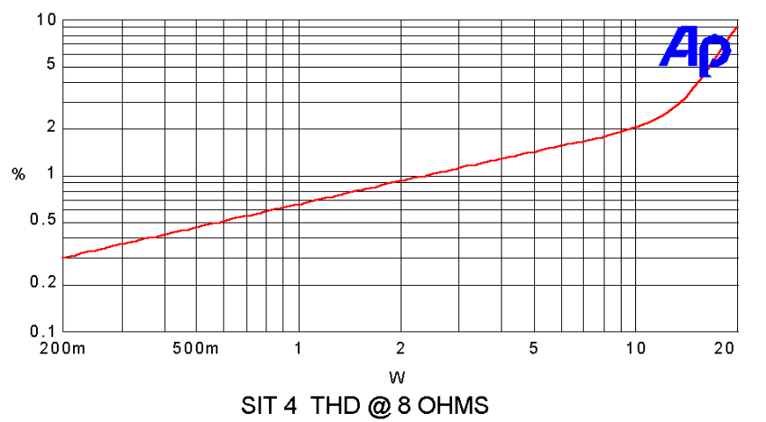 The distortion/power curve shows the 2nd harmonic dominance up to 10 watts: