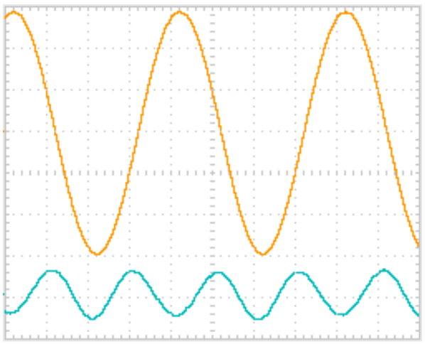 Distortion waveform (blue trace) @1Watt, showing the negative phase 2nd harmonic.