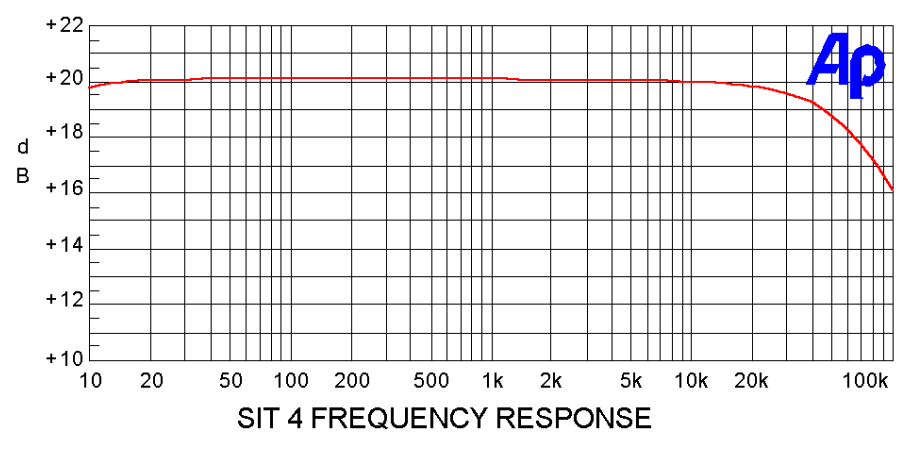 Above is the simplified diagram of the circuit of the SIT-4. This is a single-ended Class A circuit using a SIT (Q2) in common-source mode without feedback. It is biased by a conventional Mosfet “mu follower” current source Q3 and is input buffered by Q1, the NOS Toshiba 2SK170, the finest of Jfets. It has an easily driven high input impedance. It has plenty of gain, and handles 4 ohm loads – my test speakers are SR-1’s at 3.8 ohms with 86 dB/watt sensitivity, and the SIT-4 drives them surprisingly loud, although it was designed around Altecs, Klipsch, JBL, Lowthers, and other high efficiency speakers. Here are some performance graphics. Keep in mind that they are achieved in a single-stage without negative feedback. Here is the frequency response curve, showing bandwidth to -3 dB at 80 Khz.