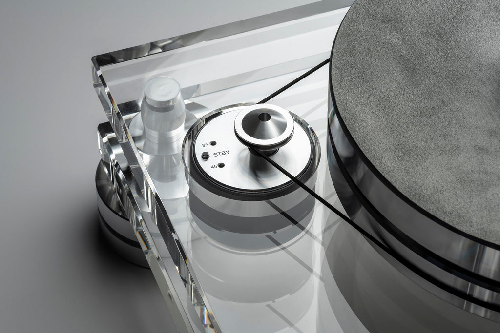 The motor is sitting in on a special foam in the lower level acrylic plinth to decouple it from the platter and the tonearm. The electronic speed control allows you to switch between 33 & 45 RPM. A silicon belt connects the motor and the two floor TPE damped platter, which is made of aluminium with additional inserts to improve the flywheel effect.