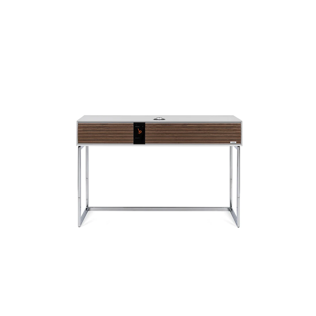 Like the iconic radiograms of yesteryear, R810 is a product that has been designed to be seen. Enhancing R810’s aesthetics is the special material we’ve selected for the handcrafted grille and veneered cabinets. Made from sustainable woods that are spliced and reconstituted, the resulting grain patterns closely resemble slow-growing hardwoods but without the ecological impact. Combined with the precision formed trims and polished chrome stand, R810 radiates sophistication and like the finest furniture, it is an object that you will cherish and be proud to have on display in your home.